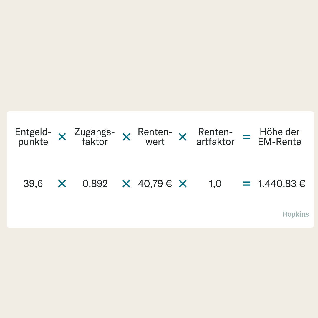 ➜ Die Formel zur Berechnung der Erwerbsminderungsrente lautet: Entgeltpunkte × Rentenartfaktor × Rentenwert = Höhe der Erwerbsminderungsrente